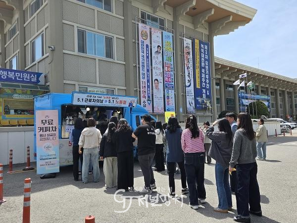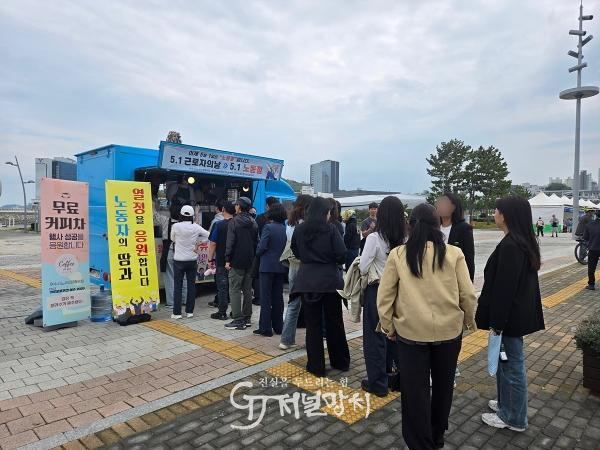 현장에는 커피차를 배치해 음료를 제공하고, 노동존중 메시지를 담은 현수막 설치와 홍보물 배부 등 참여형 방식으로 운영되며 노동의 가치와 존엄성에 대한 인식 제고에 나섰다.
