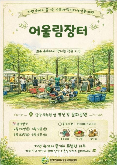 ‘어울림장터’는 담양 관내 풀뿌리공동체와 농촌인재양성과정을 통해 육성된 마을공동체, 마을기업, 사회적경제조직, 소규모 생산자 등이 참여하는 판매·체험형 장터로, 지역 생산품의 홍보와 판로 확대를 목적으로 추진된다.