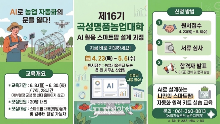 ![]() 제16기 곡성명품농업대학 AI 활용 스마트팜 설계 과정 모집 안내문 |
