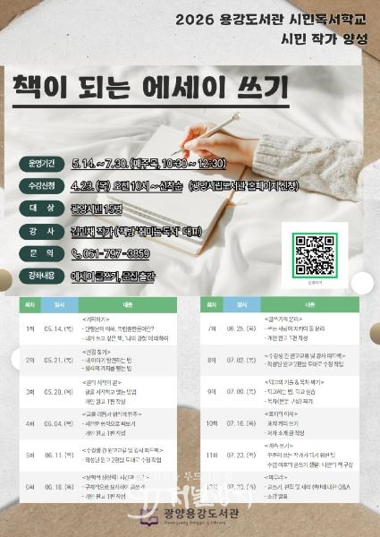 수강 신청은 4월 23일 오전 10시부터 시작되며, 글쓰기에 관심 있는 광양시민이면 누구나 참여할 수 있다. 모집인원은 15명으로 시립도서관 누리집을 통해 선착순으로 접수한다.
