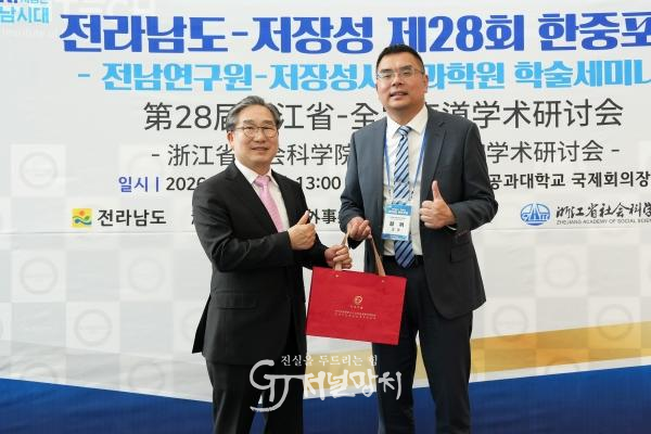 ![]() 강상구 나주시장 권한대행(왼쪽)과 왕위 저장성사회과학원 부원장(오른쪽)이 기념품을 주고받고 있다.