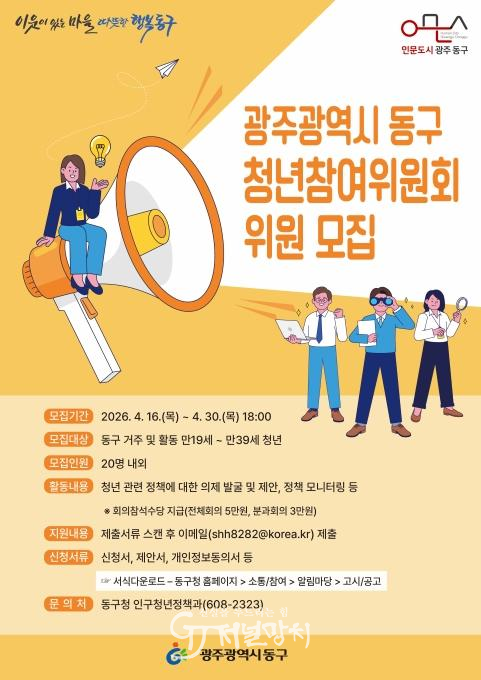 동구는 청년의 목소리를 구정에 폭넓게 반영하고, 청년이 정책 형성과 집행 과정에 실질적으로 참여할 수 있는 기반을 마련하기 위해 이번 모집을 추진한다. 특히 동구가 추진 중인 청년자율예산제와 연계해, 청년참여위원이 제안한 정책이 예산과 실제 사업으로 이어지는 참여형 행정 모델을 한층 강화한다는 방침이다.