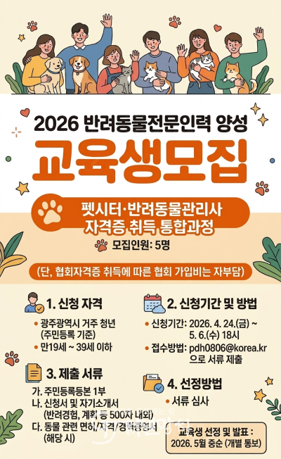 펫시터·반려동물관리사 자격증 취득 통합과정은 광주시에 거주하는 19∼39세 청년 5명을 오는 5월6일까지 모집한다. 자세한 내용은 광주청년통합플랫폼에서 확인할 수 있으며, 참여를 희망하는 청년은 주민등록등본·신청서·자기소개서 등을 구비해 전자우편(pdh0806@korea.kr)으로 접수하면 된다. 광주시는 서류 심사를 거쳐 5월 중 최종 교육생을 선정, 개별 통보한다. 자격증 취득에 필요한 교육비는 광주시가 전액 지원한다.
