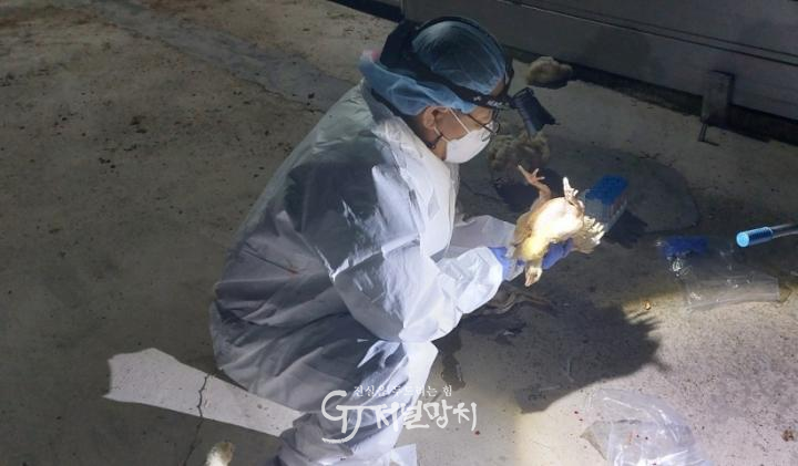 전남도동물위생시험소는 무안 발생농장과 반경 10km 방역대 닭 56호, 오리 20호 등 76개 가금농가를 대상으로 정밀검사를 한다. 시군과 시험소 가축방역관이 농장을 방문해 닭은 폐사 여부 등 임상예찰을 하고, 오리와 빈 축사는 각각 시료를 채취해 항원 검사를 한다.