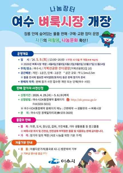 참여를 원하는 시민은 4월 29일부터 5월 6일까지 ‘여수시OK통합예약시스템’을 통해 온라인으로 신청할 수 있으며, 방문 또는 팩스(061-659-5816)로도 접수 가능하다. 판매 후 남은 물품은 아름다운가게를 통해 자유롭게 기부할 수 있다.