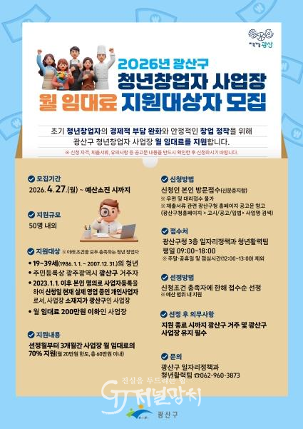제출 서류와 지원 대상, 기준 등 ‘2026년 광산구 청년 창업자 사업장 월 임대료 지원사업’에 관한 자세한 사항은 광산구 누리집 공고문에서 확인할 수 있다.