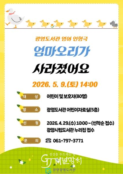광양시 관계자는 “이번 공연을 통해 어린이들이 영어를 쉽고 재미있게 접하고 가족의 의미를 되새기는 계기가 되길 바란다.”고 밝혔다.