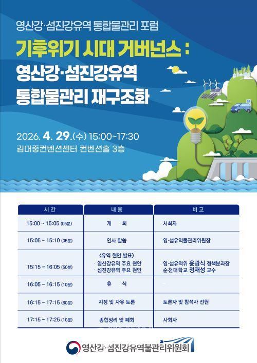 포럼에는 영산강유역환경청, 영산강홍수통제소, 한국환경연구원, 학계, 시민단체 등 물관리 분야 전문가와 이해관계자 약 70여 명이 참석해 기후위기 시대에 대응하기 위한 영산강ㆍ섬진강유역 통합물관리 재구조화 방안을 심도 있게 논의할 예정이다.