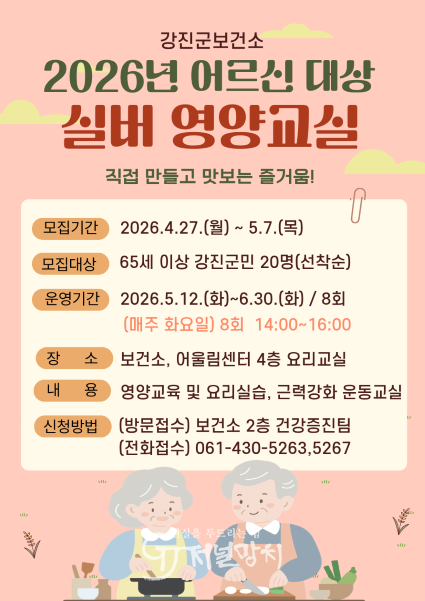 강진군 관계자는 “어르신들이 노년기에 맞는 식생활 지침과 건강한 조리 방법을 배우며 스스로 건강을 관리할 수 있는 좋은 기회가 될 것”이라며 “이번 프로그램을 통해 주민들이 건강관리에 한 걸음 더 다가서고 활기찬 노년을 보내시길 바란다.”고 말했다.