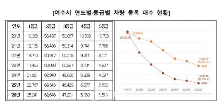 여수시는 배출가스 저감사업 추진 결과, 노후 경유차는 감소하고 저공해 차량은 증가하는 추세를 보이고 있다. 5등급 차량은 2020년 약 1만 대에서 올해 3,500여 대로 줄어 약 67% 감소했으며, 같은 기간 1등급 차량은 2만 5천 대 이상으로 늘어 친환경 차량 중심의 전환이 가속화되고 있다.