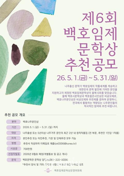 제6회 백호임제문학상은 백호시문학상, 백호젊은시인상, 백호나주문인상 등 3개 부문으로 운영되며 이 중 나주문인상은 기존 공모 방식에서 비공모와 추천제를 병행하는 방식으로 개편됐다.