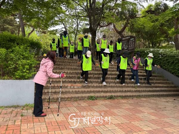 ![]() 노르딕워킹 교실 참여자들이 강사의 지도에 따라 폴 사용법과 보행 자세를 익히고 있다. |