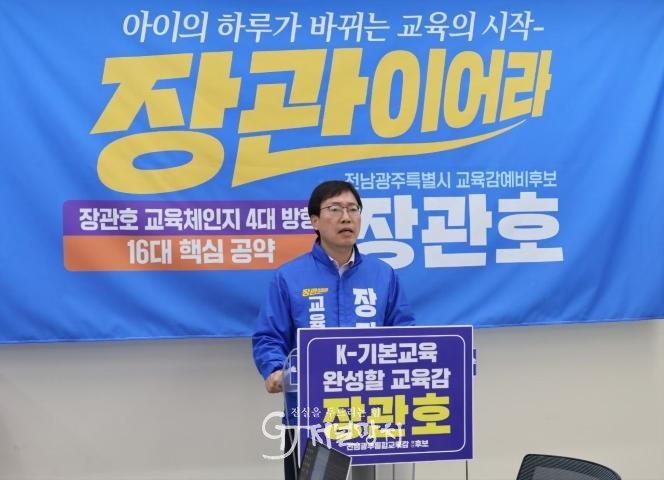 장관호 후보는 전남·광주 통합으로 확보되는 추가 재정에 대해 “전액을 학생과 학교 현장에 투자하겠다. 행사가 아닌 교실에, 현수막이 아닌 아이들의 꿈에 투자하겠다.”고 강조했다.