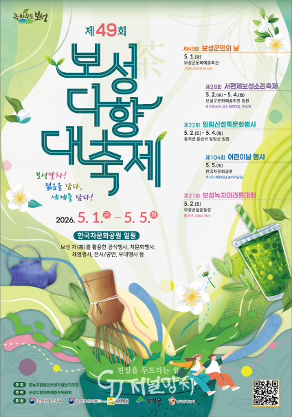 한편, ‘제49회 보성다향대축제’가 개최되는 5월 1일부터 5일까지 보성군 일원에서 ▲보성군민의 날(문화예술회관/5.1.), ▲서편제보성소리축제(문화예술회관/5.2.~5.4.), ▲보성녹차마라톤대회(보성공설운동장/5.2.), ▲일림산철쭉문화행사(일림산/5.2.~5.4.) ▲보성어린이날 행사(한국차문화공원 잔디광장/5.5.) 등 다양한 문화·관광 프로그램이 함께 진행된다.