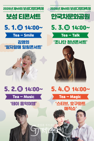 ![]() 보성군, 제49회 보성다향대축제 신규 콘텐츠 확대_‘보성 Tea-Concert’ 라인업 |