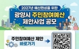광양 GJ저널망치2026. 04.02[GJ저널 망치] 광양시는 시민이 예산 편성 과정에 직접 참여할 수 있도록 6월 30일까지 ‘2027년 예산 반영 주민참여예산 제안사업’을 집중 공모한다고 밝혔다. 이번 공모는 예산 과정에 다양한 계층의 참여를 확대하고, 시민이 일상에서 느끼는 불편 사항과 지역 발전을 위한 아이디어를 시정에 반영하기 위해 마련됐다. 제안 분야는 ▲청년 희망 및 중장년 행복 기반 조성 ▲여성 안전 및 어르신 건강 도시 지향 사업 ▲안전하고 쾌적한 도시 조성 등 시정 전반이다. 다만 특정 단체나 개인 지원을 목적으로 하거나 이미 시행 중인 ...