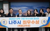 [GJ저널 망치] 전라남도 나주시가 지역과 기업이 함께 참여한 폐현수막 재활용 시범 사업으로 행정안전부 주관 ‘2025년 지역-기업 협업 우수 사례 공모전’에서 최우수상에 선정돼 자원순환 선도 도시로서의 경쟁력을 다시 한번 입증했다. 나주시(시장 윤병태)는 행정안전부가 주관한 이번 공모전에 나주, 세종, 강릉, 청주, 창원 등 5개 지자체가 협업팀을 구성해 폐현수막 재활용 시범 사업으로 참여했으며 서면 심사와 발표 심사를 거쳐 최우수 사례로 최종 선정돼 특별교부세를 지원받게 됐다고 17일 밝혔다. 이번에 최우수 평가를 받...