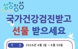 환경 GJ저널망치2026. 04.28[GJ저널 망치] 장성군보건소가 의료급여를 받는 주민을 대상으로 ‘국가건강검진 참여 응원 이벤트’를 운영한다. 짝수년에 출생한 20~64세 의료급여 수급 주민이면 누구나 참여할 수 있다. 군은 6월까지 국가건강검진을 받은 사람 가운데 선착순 100명에게 사은품을 증정할 계획이다. 자세한 내용은 건강증진과 방문보건팀(061-390-8340)에서 안내받으면 된다. 장성군보건소 관계자는 “이번 행사가 건강검진에 대한 많은 관심과 참여로 이어지기를 기대한다.”고 말했다.