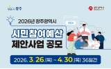 [GJ저널 망치] 광주광역시는 2027년도 예산 과정에 시민참여를 보장하기 위한 ‘시민참여예산 제안사업’을 4월30일까지 접수한다. 시민참여예산은 재정 운영의 투명성을 높이고, 재정민주주의를 강화해 시민 삶의 질을 향상시키기 위한 제도다. 광주시에 거주하는 시민이나 단체는 누구나 사업을 제안할 수 있다. 제안 대상 사업은 단년도에 완료되는 광주시 소관 사무로 ▲시정참여형 ▲청년참여형 등 두 가지를 접수한다. 시정참여형은 시민 생활과 밀접하고 시민 수혜도가 높은 5억원 이하 사업이다. 청년참여형은 일자리, 창업지원, ...