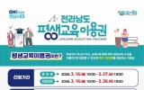 경제 GJ저널망치2026. 03.23[GJ저널 망치] 전라남도와 전남인재평생교육진흥원은 오는 27일까지 저소득층과 장애인을 대상으로 ‘2026 전라남도 평생교육이용권’ 1차 신청을 받는다고 밝혔다. 평생교육이용권은 사회·경제적 여건에 따른 평생교육 참여 격차를 완화하고 교육 기회를 확대하기 위해 교육비를 지원하는 제도다. 연간 1인당 35만 원 상당의 포인트를 충전해 지급하는 방식으로 운영된다. 지원 대상은 전남에 주민등록을 둔 19세 이상 성인과 등록장애인, 65세 이상 노인, 디지털 평생교육 수강 희망자 등이다. 1차 모집은 저소득층과 등록장애...