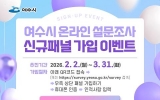 여수 GJ저널망치2026. 03.18[GJ저널 망치] 여수시가 오는 3월 31일까지 ‘온라인 설문조사 신규 패널 가입 이벤트’를 실시한다고 밝혔다. 시에 따르면 시정 정책 전반에 시민의 의견 수렴하기 위해 온라인 설문조사를 추진 중이며 ‘온라인 설문조사 패널’에 가입하면 각종 설문조사에 참여할 수 있다. 이벤트 기간은 오는 3월 31일까지이며 여수시민이면 누구나 가입 가능하다. 패널 가입은 이벤트 기간 이후에도 연중 가입할 수 있다. 가입 방법은 아래 QR코드를 통해 접속하거나 여수시 온라인 설문조사 누리집 (https://survey.yeosu.go...