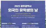 광주광역시 GJ저널망치2025. 10.29[GJ저널 망치] 광주광역시(시장 강기정)는 ‘2025 광주 외국인 유학생의 날’ 행사에 참가할 유학생을 오는 11월 7일까지 모집한다. ‘광주 외국인 유학생의 날’은 외국인 유학생들이 자신의 재능을 발휘하고, 내국인 청년·시민들과 문화 교류를 통해 지역 정착을 돕는 축제의 장으로, 광주시는 지난 2023년부터 해마다 개최하고 있다. 올해 행사는 오는 11월 13일 5·18민주광장에서 ‘전남대 국제교류의 날’ 행사와 함께 열리며 유학생 장기자랑, 대한외국인 N행시 백일장, 유학생활 토크 콘서트(V-talk) 등 다양한 프...