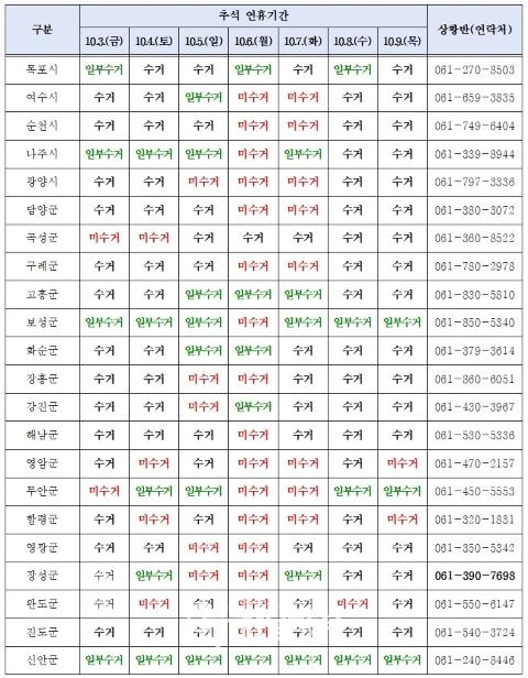 | 추석 연휴 쓰레기 수거일 시군 누리집서 미리 확인하세요 전남도, 쾌적한 연휴 위해 생활폐기물 관리 대책 추진 GJ저널망치 gjm2005@daum.net |
