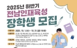 함평 GJ저널망치2025. 11.04[GJ저널 망치] 전라남도와 전남인재평생교육진흥원은 실질적인 교육기회 보장과 미래인재로의 성장, 지역 정착을 지원하기 위한 2025년 하반기 전남인재육성 장학생을 오는 31일까지 모집한다. 신청 대상은 공고일 기준 학생 본인 또는 보호자(부 또는 모, 후견인)가 1년 이상 계속해서 전남도에 주민등록이 돼있는 초·중·고등학생과 대학생, 공고일 기준 전남도에 1년 이상 체류 중이며 남은 체류 기간이 6개월 이상인 외국인 유학생이다. 선발분야는 ▲전남인재 장학금 ▲전남정착 장학금 ▲특별지정 장학금 총 3개의 분야 15종이며, ...